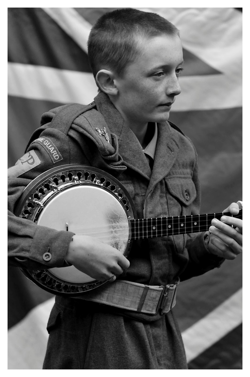 Image 7: This was one of those "Moment" photographs, where a young lad picked up a Banjo and started singing "When I'm cleaning windows" by the late George Formby. adding to the impact of the photograph is the Union Jack draped over the wall behind him. I think this is one of those pictures that could evoke feelings of patriotism, and being witness to his rendition of the song first hand and in the setting described above and can definitely attest to that.